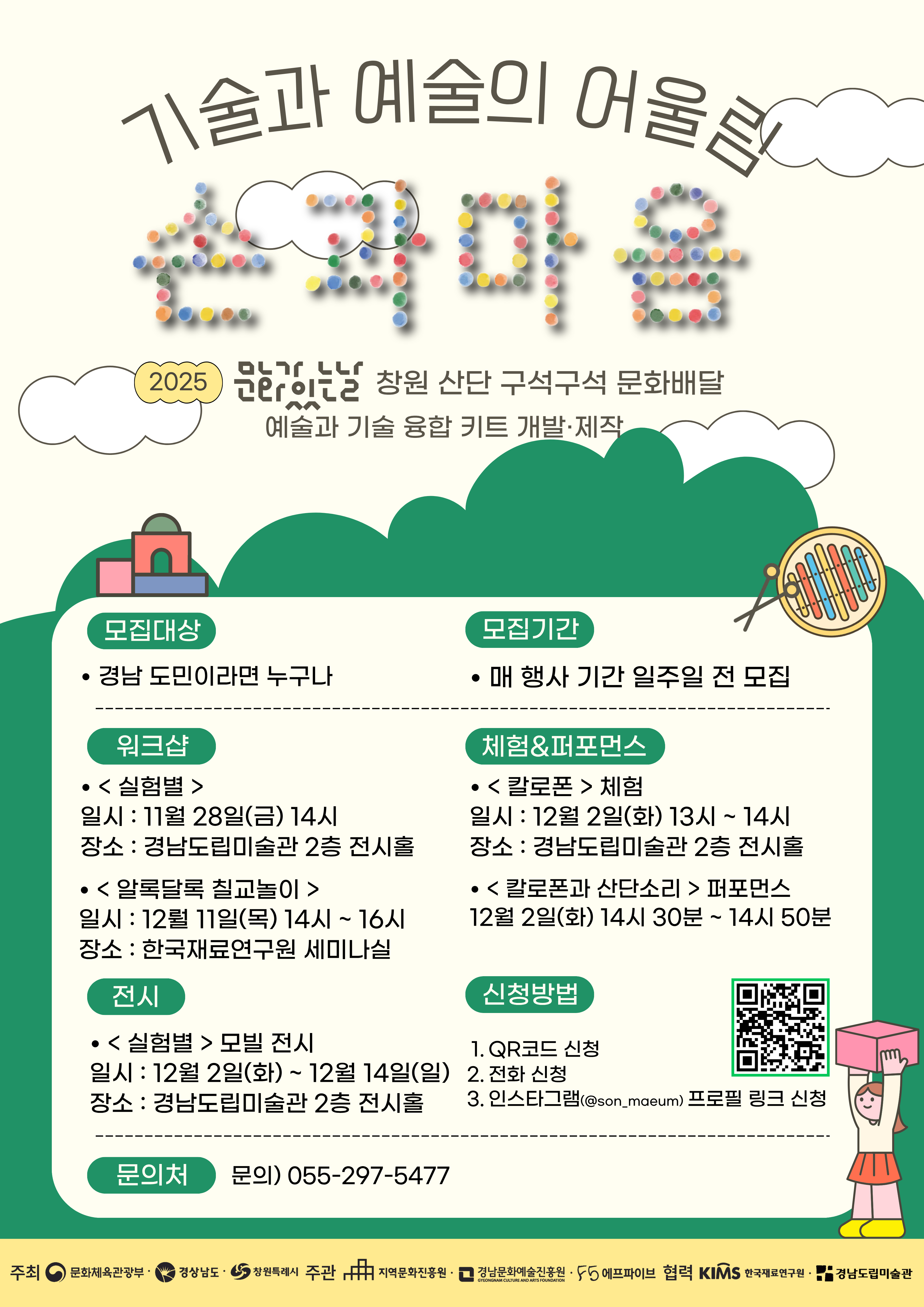 경남문화예술진흥원에서는 2025 문화가 있는 날 창원산단 구석구석 문화배달의 일환으로 <예술과 기술을 융합의 키트 개발·제작 - 손과 마음>을 아래와 같이 운영하고자 합니다. 관내 초··고등학교 학생 및 가족의 많은 관심과 참여를 바랍니다.