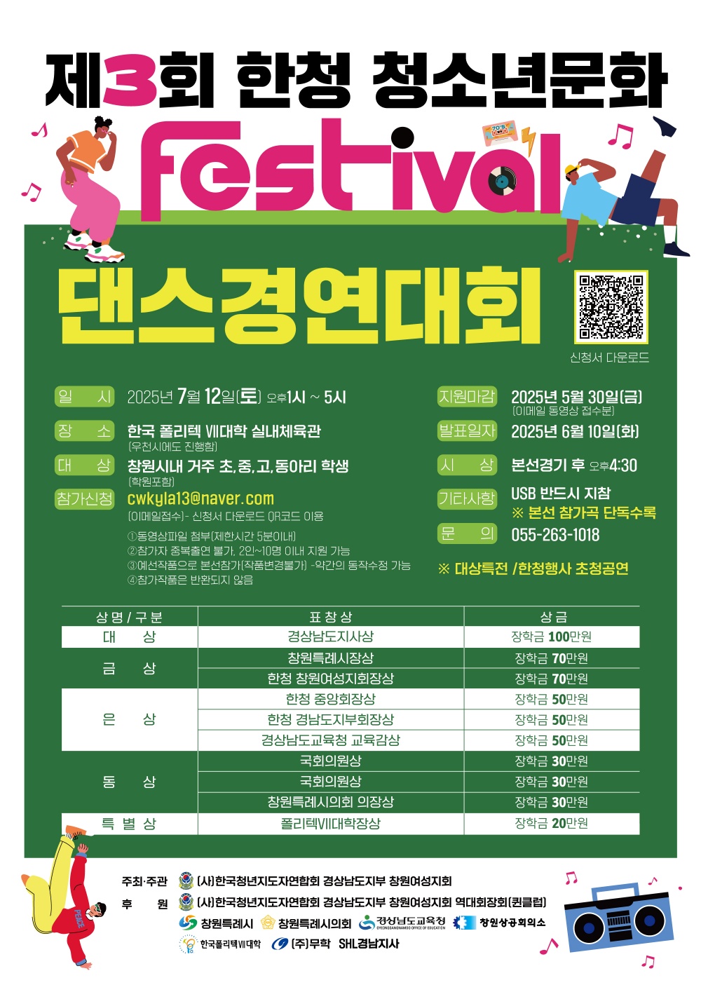 -일 시 :2025. 7. 12.(토) 13:00∼17:00 ※ 참가신청마감 : 5.30.(금) -장 소 : 한국폴리텍Ⅶ대학 실내체육관(경남 창원시 성산구 외동반림로 51-88) - 대 상 : 창원시내 거주 초, 중, 고, 동아리 학생 - 내 용 : 청소년 댄스경연대회, 시상식, 초청공연 등 - 문 의 : 한청 창원여성지회(055-263-1018)