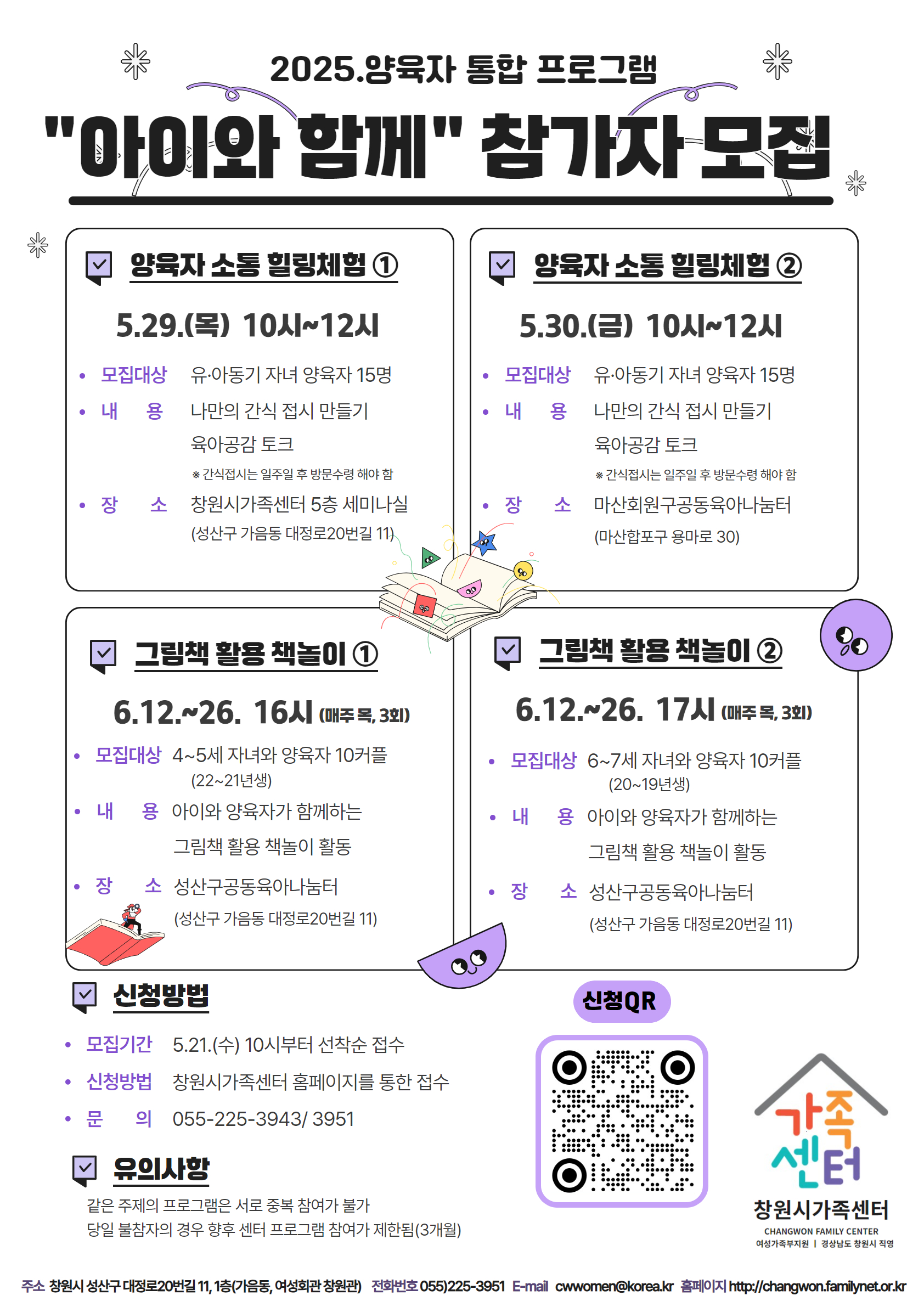 창원시가족센터에서 운영하는 [양육자통합프로그램 '아이와 함께] 및 [창원 부모교육 '유아기]참가자를 다음과 같이 모집합니다. 많은 관심과 참여를 바랍니다. *프로그램 개요 구 분 | 양육자통합프로그램 '아이와 함께' | 유아기 부모교육 | 양육자소통힐링① | 양육자소통힐링② | 그림책활용책놀이①② | 일 시 | 5.29.(목) 10시 | 5.30.(금) 10시 | 6.12.~26.(매주 목, 총3회) ①16시 ②17시 | 6.10.~12.(매주 화·목) 10~12시 (총4회) | 내 용 | 나만의 간식 접시 만들기, 육아공감 토크 | 나만의 간식 접시 만들기, 육아공감 토크 | 아이와 양육자가 함께하는 그림책 활용 책놀이 활동 | 충분히 사랑하고 제대로 가르치기 (부모양육태도검사를 통한 육아의 균형찾기) | 대 상 및 인 원 | 유·아동기 자녀 양육자 15명 | 유·아동기 자녀 양육자 15명 | ①16시_4~5세 자녀와 양육자 10커플 ②17시_6~7세 자녀와 양육자 10커플 | ~7세 자녀 양육자 15명 | 장 소 | 창원시가족센터 | 마산회원구공동육아나눔터 | 성산구공동육아나눔터 | 창원시가족센터 | 모집기간 | 5.21.(수) 10시부터 선착순 접수 마감 | ~ 6.4까지 선착순 접수 마감 | 신청방법 | 창원시가족센터 홈페이지(https://changwon.familynet.or.kr)를 통한 접수 | 온라인 신청서 제출 (https://forms.gle/XjeKVd7gMgiioefN9) | 문 의 | 여성족과 창원시가족센터(☎225-3951, 3943) |