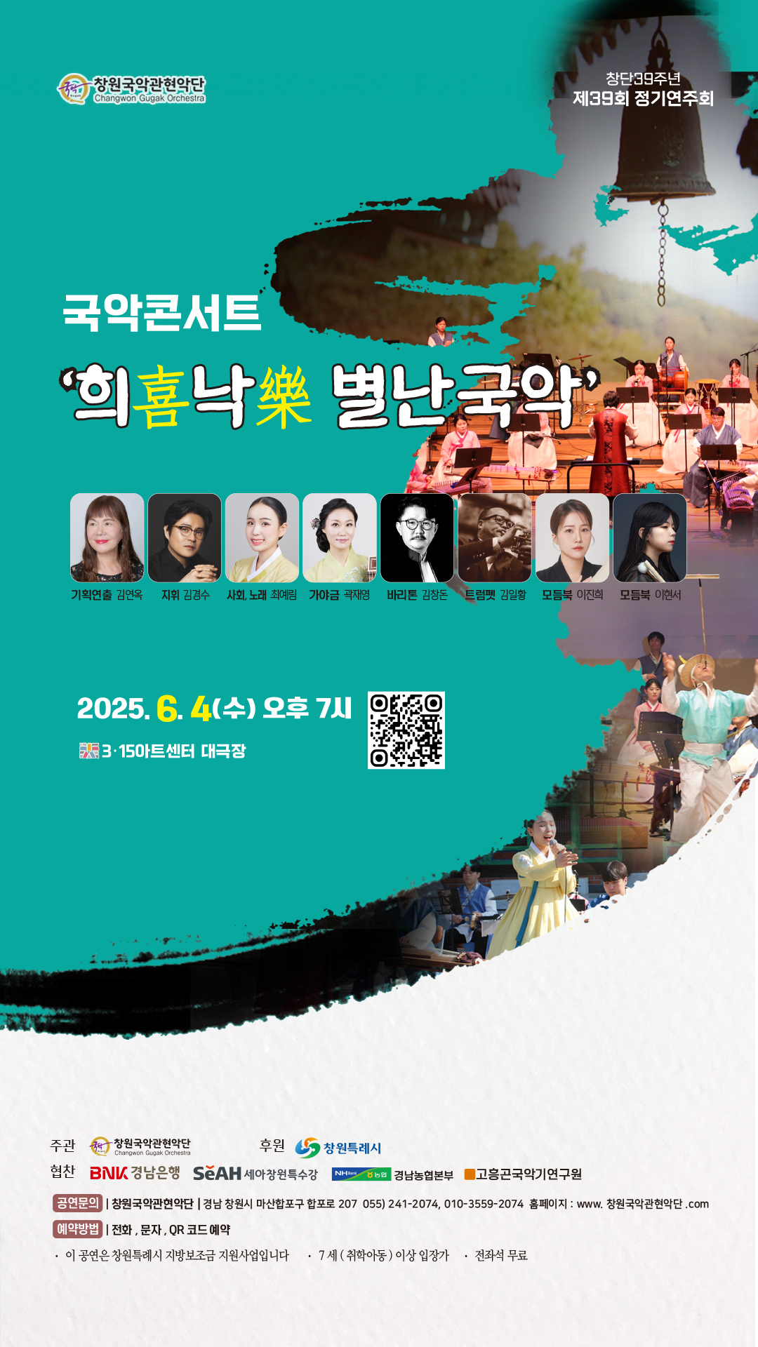 가. 일시: 2025년 6월 4일(수) 19:00~20:30 나. 장소: 3·15아트센터 대극장 다. 주관: 창원국악관현악단 라. 참여대상: 초, 중, 고등학생, 학부모 등 마. 접수방법:전화, 문자, QR코드(https://naver.me/GEiNk4PV), 선착순 접수 바. 관람금액: 무료 사. 문의 및 예약: 055)241-2074