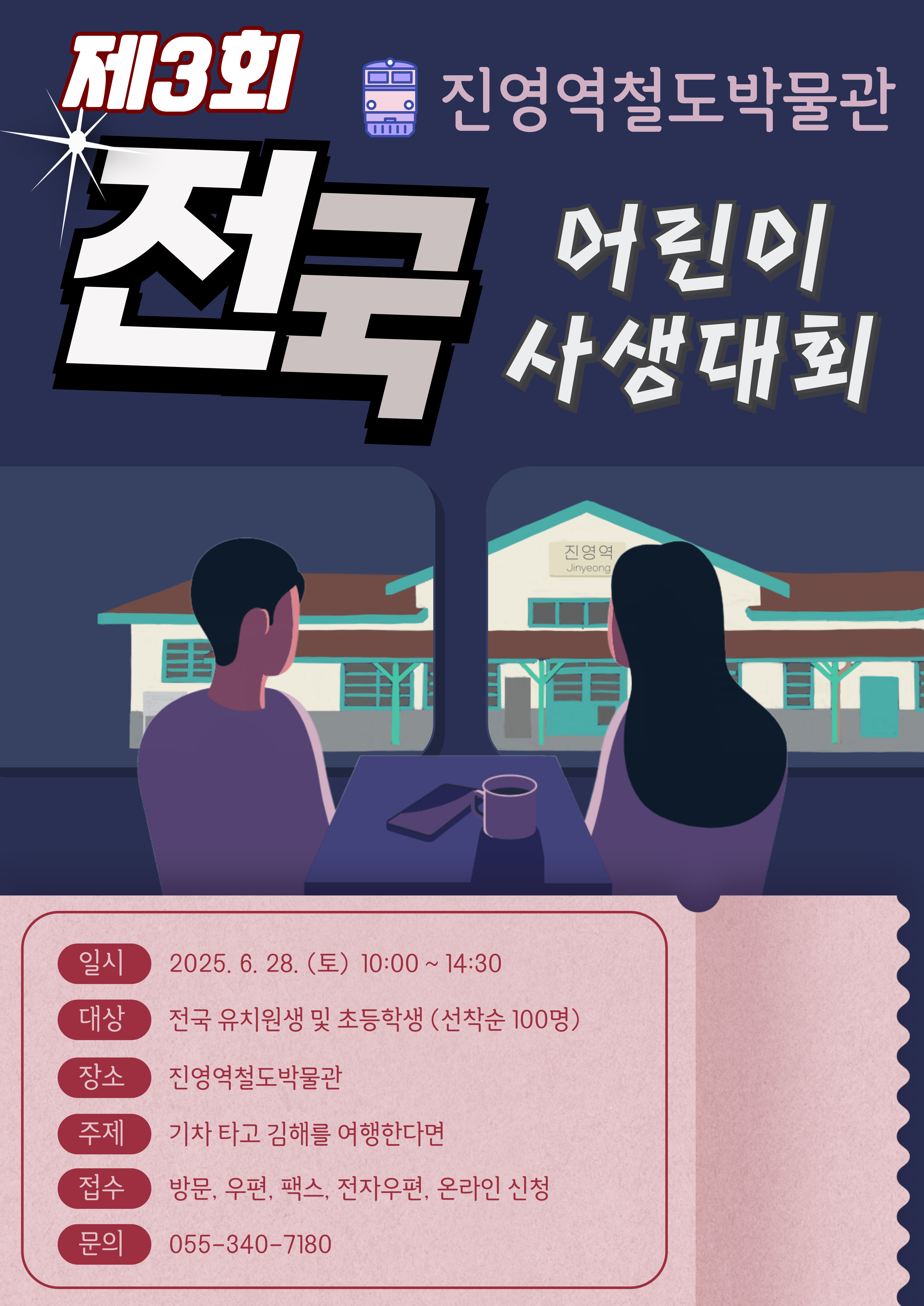 ○ 대 회 명 : 제3회 진영역철도박물관 전국 어린이 사생대회 ○ 대회일시 : 2025. 6. 28.(토) 10:00 ~ 14:30 ○ 대회장소 : 진영역철도박물관(김해시 진영읍 진영로 145-1) 일원 ○ 참가대상 : 전국 유치원·초등학생 (100명 내외, 선착순 접수) ○ 참가접수 : 2025. 5. 20.(화) ~ 6. 20.(금)※ 6월 20일 소인분에 한함 - 진영역철도박물관 누리집 내 게시된 참가신청서, 개인정보 활용동의서 작성 후 제출하거나 온라인 URL을 통해 참가 신청 - 방문 및 우편접수 : 김해시 진영읍 진영로 145-1, 진영역철도박물관 - 팩스 : 055-722-0905 / 전자우편 : kymin@korea.kr - 온라인 신청 : https://naver.me/5jJO8mhX ○ 참가비용 : 무료 ○ 시상내역 : 심사를 통해 ‘김해시장상’ 수여 ○ 문 의 : 055-340-7180 |