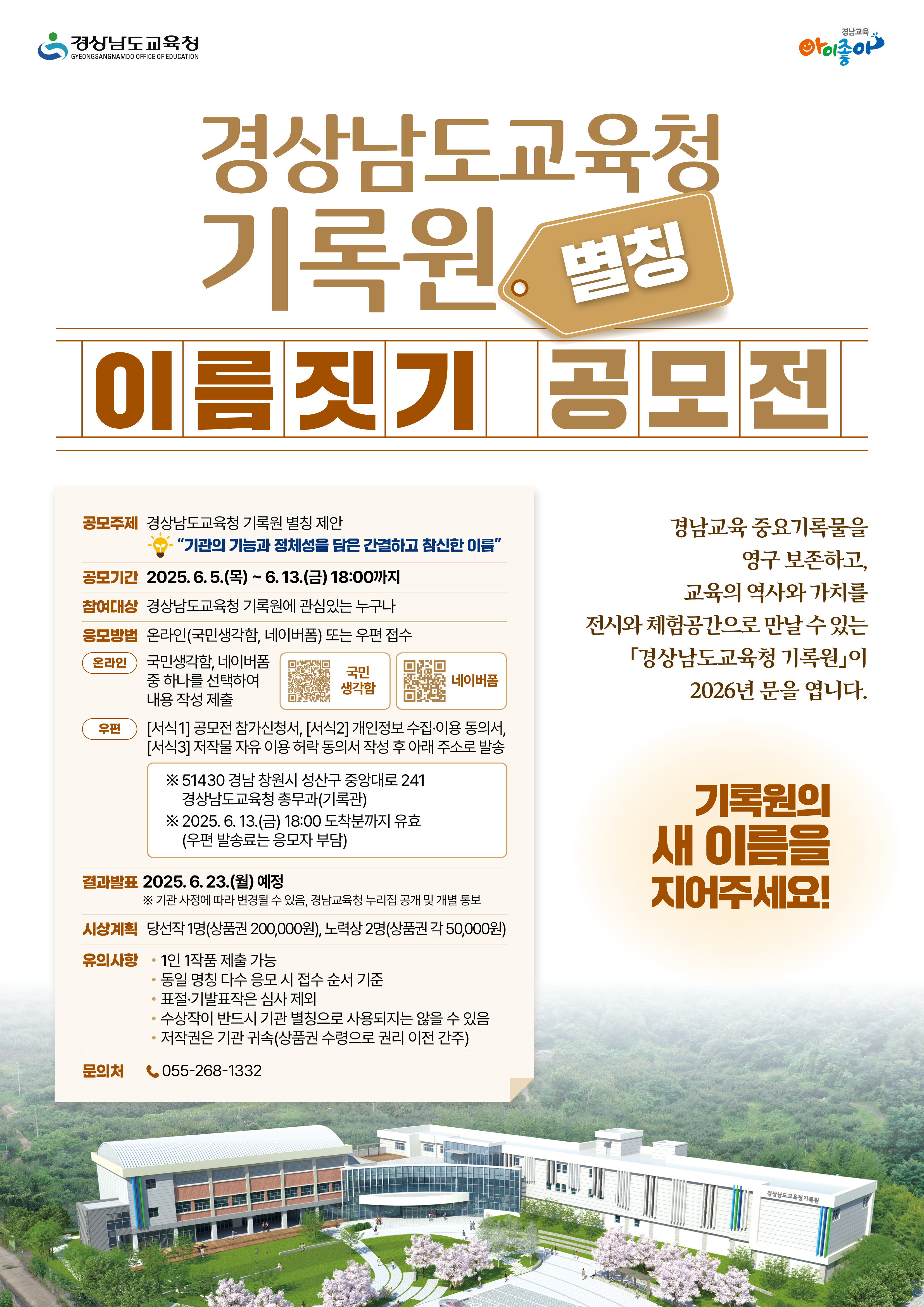경상남도교육청 기록원의 기능과 정체성을 담은 도민이 공감할 수 있는 기관 별칭 제정을 위해, 「경상남도교육청 기록원 별칭 이름짓기 공모전」다음과 같이 개최합니다. 가. 공모명칭: 《경상남도교육청 기록원》 별칭 이름짓기 공모전 나. 공모기간: 2025. 6. 5.(목) ~ 6. 13.(금) 18:00까지 다. 참가자격: 경상남도교육청 기록원에 관심있는 누구나 ※ 1인 1작품, 중복참여 불가 라. 응모방법: 온라인(국민생각함, 네이버폼) 또는 우편접수 마. 시상계획: 당선작 1명(상품권 200,000원), 노력상 2명(상품권 각 50,000원) 바. 결과발표: 2025. 6. 23.(월) 예정, 경상남도교육청 누리집 공개 및 개별 통보