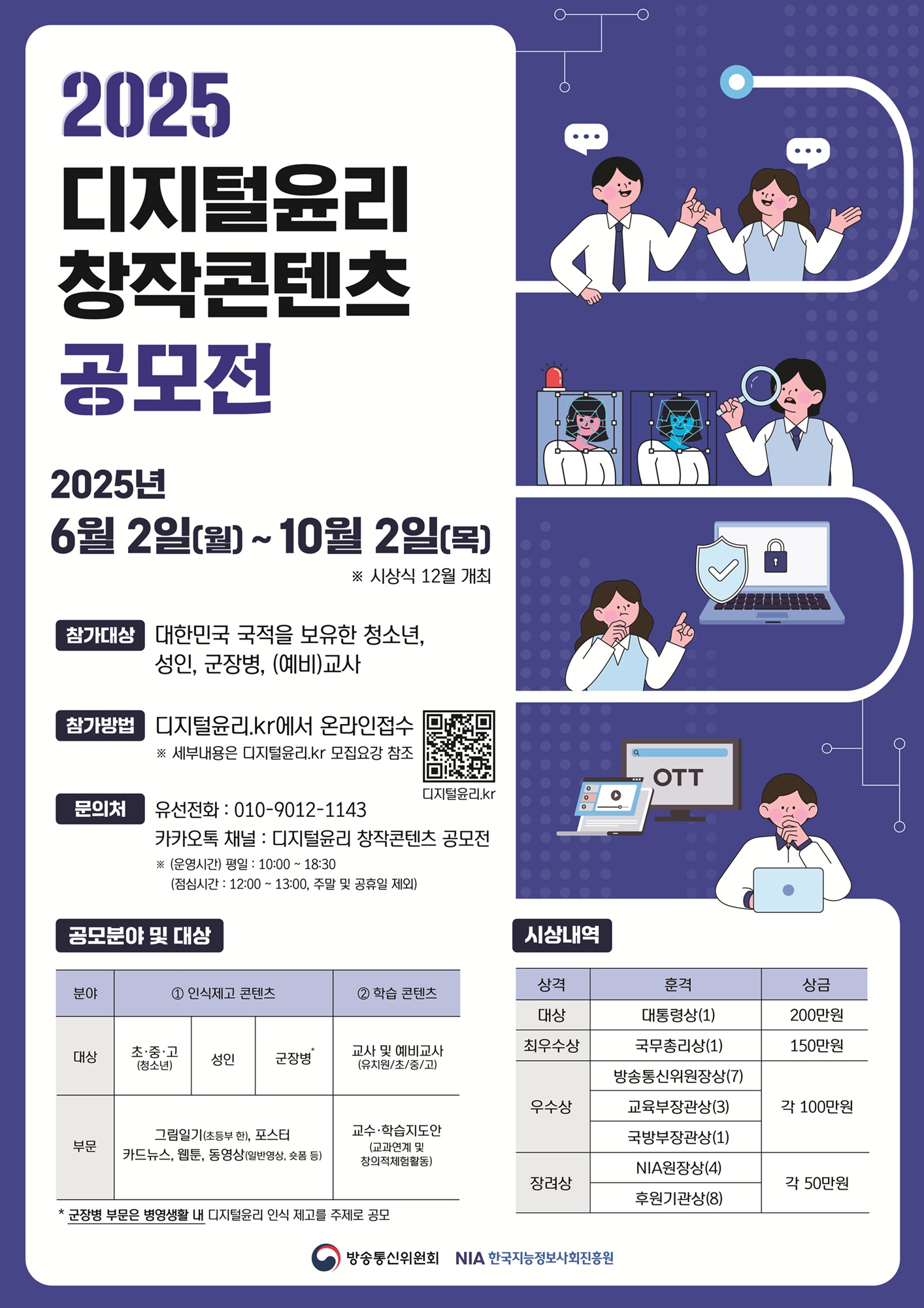 o 공모기간 : '25년 6월 2일(월) ~ 10월 2일(목) o 제출방법 : 디지털윤리.kr에서 온라인 접수 o 시상규모 : 대통령상, 국무총리상, 방통위원장상, 교육부장관상 등 총 25점 (총 상금 2,050만원) o 결과발표 : '25년 11월(예정) o 시 상 식 : '25년 12월(예정)