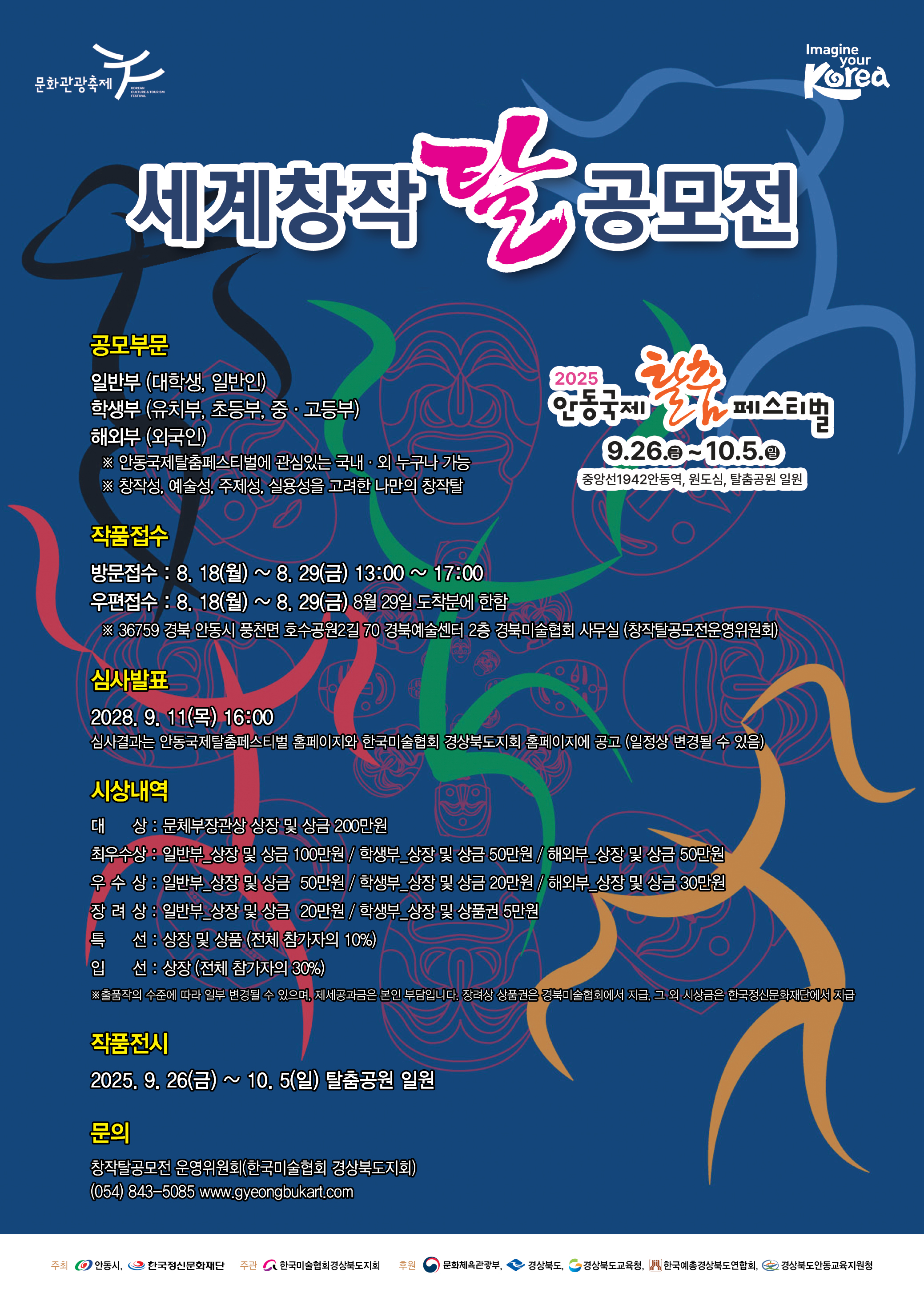 문화체육관광부 지정 대한민국 명예대표 문화관광축제 안동국제탈춤페스티벌이2025년 9월 26일(금)부터 10월 5일(일)까지 10일간 개최됩니다. 많은 관심과 참여를 바랍니다. 가. 공 모 명 :2025 안동국제탈춤페스티벌 「세계창착탈 공모전」 나. 접수기간 :2025. 8. 18.(수) ~ 2025. 8. 29.(금) 12일간 다. 분 야 1) 일반부 : 전국 대학생, 일반인 2) 학생부 : 유치부, 초등부, 중·고등부 3) 해외부 : 외국인(대한민국 국적 미소지자 또는 귀화한 자) 라. 접수방법 :출품 작품과 함께 신청서 작성 후 방문 또는 우편접수 1) 홈페이지 : www.gyeongbukart.com 2) 주 소 : 경북 안동시 풍천면 호수공원2길 70, 경북예술센터 2층 ※13:00 ~ 17:00까지 운영하며 토, 일, 공휴일은 제외 라. 문 의 처 : 창작탈공모전 운영위원회(☎054-843-5085)