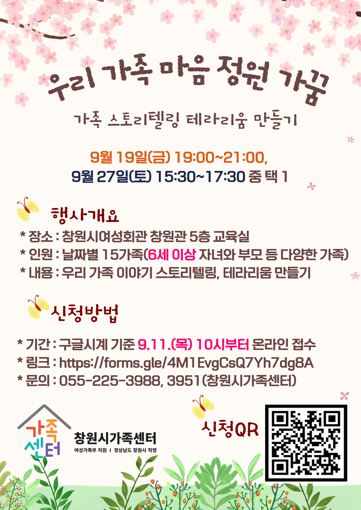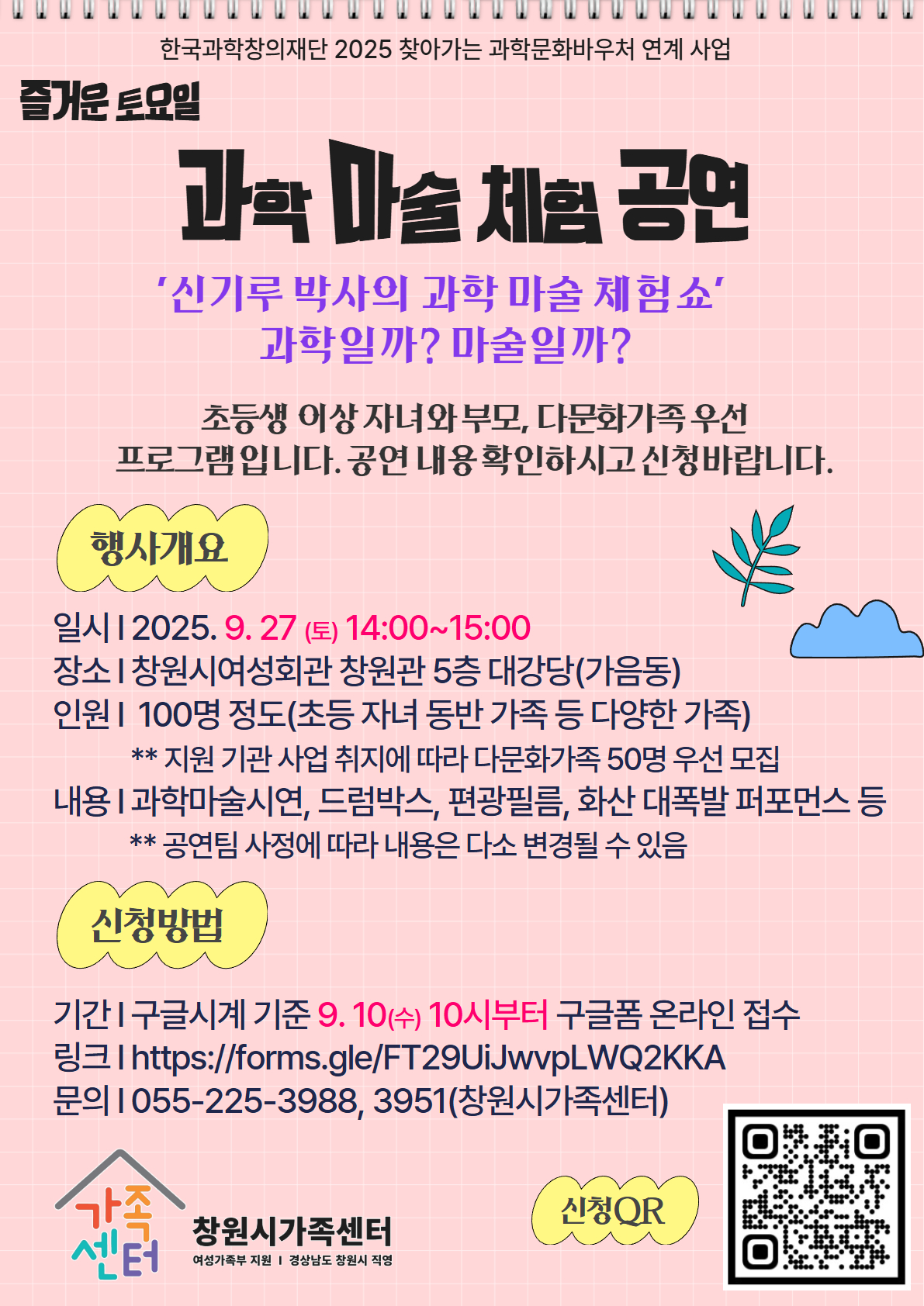 창원시가족센터「가족친화 문화프로그램 및 부부교육」참가자를 다음과 같이 모집하오니 많은 관심과 참여를 바랍니다. 1. 가족친화 문화프로그램 개요 구분 | 우리 가족 마음 정원 가꿈 | 즐거운 토요일, 과학 마술 체험 공연 | 일정 | 9.19.(금) 19:00~21:00,9.27.(토) 15:30~17:30/ 택1 | 9.27.(토) 14~15시 | 장소 | 창원시가족센터 5층 강의실 | 창원시가족센터 5층 대강당 | 인원 | 회당 15가족(6세 이상 자녀와 부모 등 다양한 가족) | 100여명(초등 자녀 동반 가족 등 / **다문화가족 50명 우선) | 내용 | 우리 가족 이야기 스토리텔링, 테라리움 만들기 | 신기루 박사의 과학 마술 체험쇼, 과학일까? 마술일까? | 신청 방법 | 9.11.(목) 10시부터 (https://forms.gle/4M1EvgCsQ7Yh7dg8A) | 9.10.(수) 10시부터 (https://forms.gle/FT29UiJwvpLWQ2KKA) | ※ 온라인 신청서(구글폼) 선착순 접수 마감 | 문의 | 여성가족과(창원시가족센터 ☎ 225-3988, 3951) |