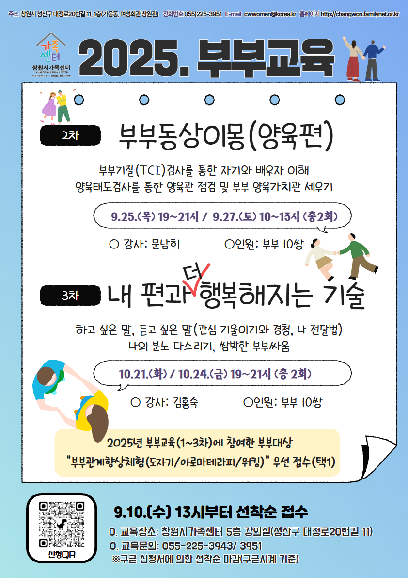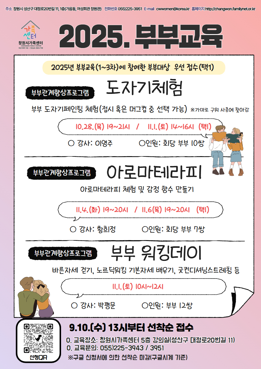 2. 2025 부부교육 프로그램 개요 구분 | 2차 부부교육 부부동상이몽(양육편) | 3차 부부교육 내 편과 더 행복해지는 기술 | 부부관계향상프로그램 (※ 3개 프로그램 중 택1) | 도자기 체험 | 아로마테라피 | 부부 워킹데이 | 일정 | 9.25.(목) 19~21시, 9.27.(토) 10~13시, 총 2회 | 10.21.(화), 10.24.(금) 19~21시, 총 2회 | 10.28.(목) 19~21시, 11.1.(토) 14~16시,택1 | 11.4.(화), 11.6.(목) 19~20시,택1 | 11.1.(토) 10~12시 | 장소 | 창원시가족센터 5층 강의실 | 인원 | 부부 10쌍 | 부부 10쌍 | 회당 부부 10쌍 | 회당 부부 7쌍 | 부부 12쌍 | ※ 2025 부부교육(1~3차) 참가자 우선 접수, 중복 신청 불가 | 내용 | 부부기질(TCI) 검사, 양육가치관세우기 등 | 경청, 분노다스리기, 쌈박한 부부싸움 등 | 부부 도자기 페인팅 (접시 또는 머그컵) | 감정 향수 만들기 등 | 노르딕워킹 기본 자세 배우기 등 | 신청 방법 | 구글시계 기준9.10.(수) 13시부터 온라인 신청서(https://forms.gle/t4F6GxAzLQuv4vbj7) 선착순 접수 마감 | 문의 | 여성가족과(창원시가족센터 ☎ 225-3943, 3951) |