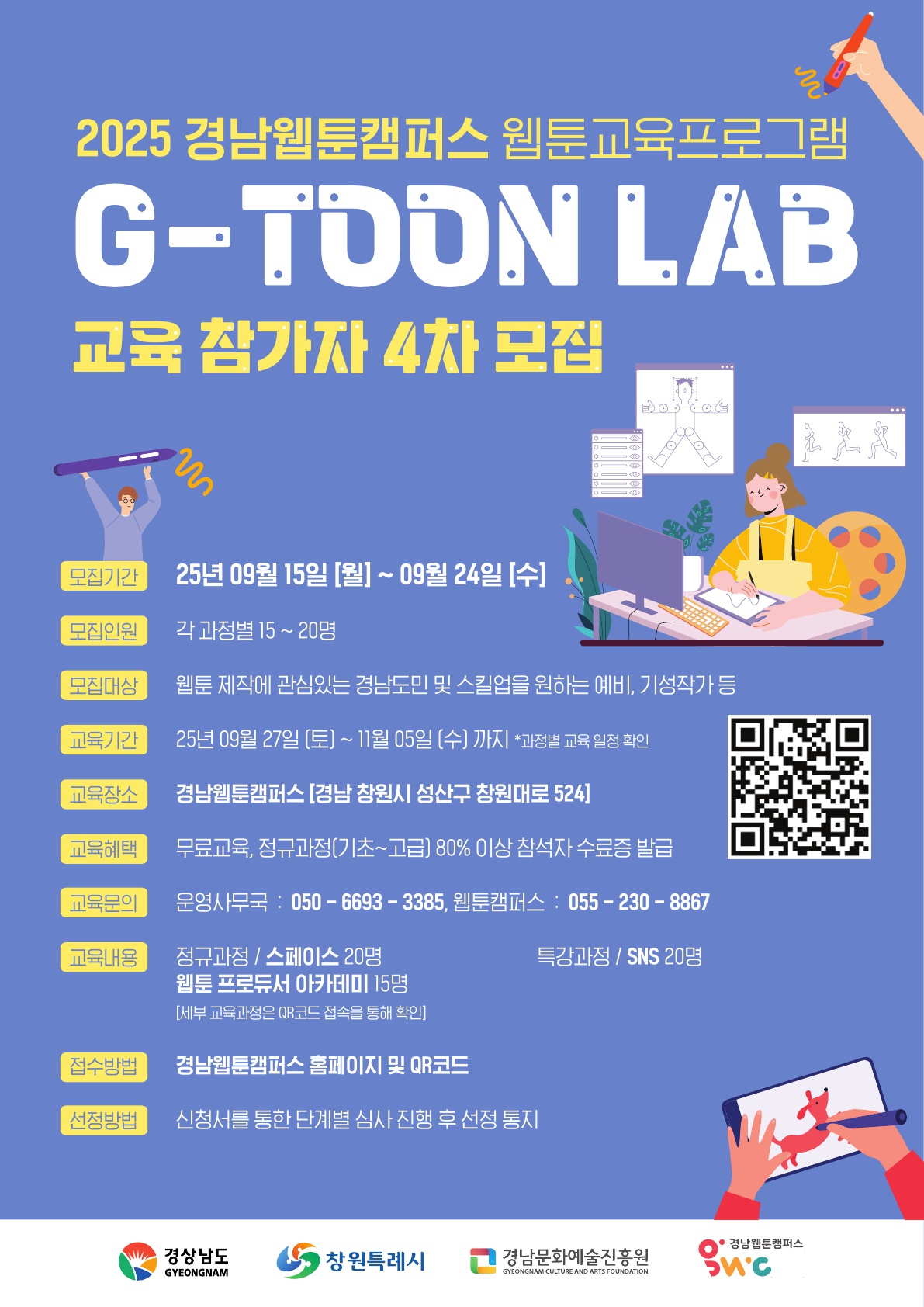 (재)경남문화예술진흥원 경남웹툰캠퍼스에서는 「웹툰 교육 프로그램(4차)」에 참여할 교육생을 모집하고 있습니다. 많은 관심과 참여를 바랍니다. 가. 교 육 명: 2025 경남웹툰캠퍼스 웹툰 교육 프로그램 정규 및 특강과정 나. 모집대상: 경남도민 및 예비작가·기성작가 다. 모집기간: 2025. 9. 15(월) ~ 9. 24(수) 라. 교육기간: 2025. 9.27(토) ~ 11. 5(수) 마. 교육장소: 경남웹툰캠퍼스(경남 창원시 성산구 창원대로 524) 바. 교육혜택: 무료교육 마. 신청방법: 경남문화예술진흥원 및 경남웹툰캠퍼스 누리집 내용 확인 및 구글폼, QR코드 접수 바. 문 의 - 경남웹툰캠퍼스 웹툰 교육 프로그램 운영 사무국: 050-6693-3385 - (재)경남문화예술진흥원 콘텐츠산업본부 차세대콘텐츠팀 담당자: 055-230-8867
