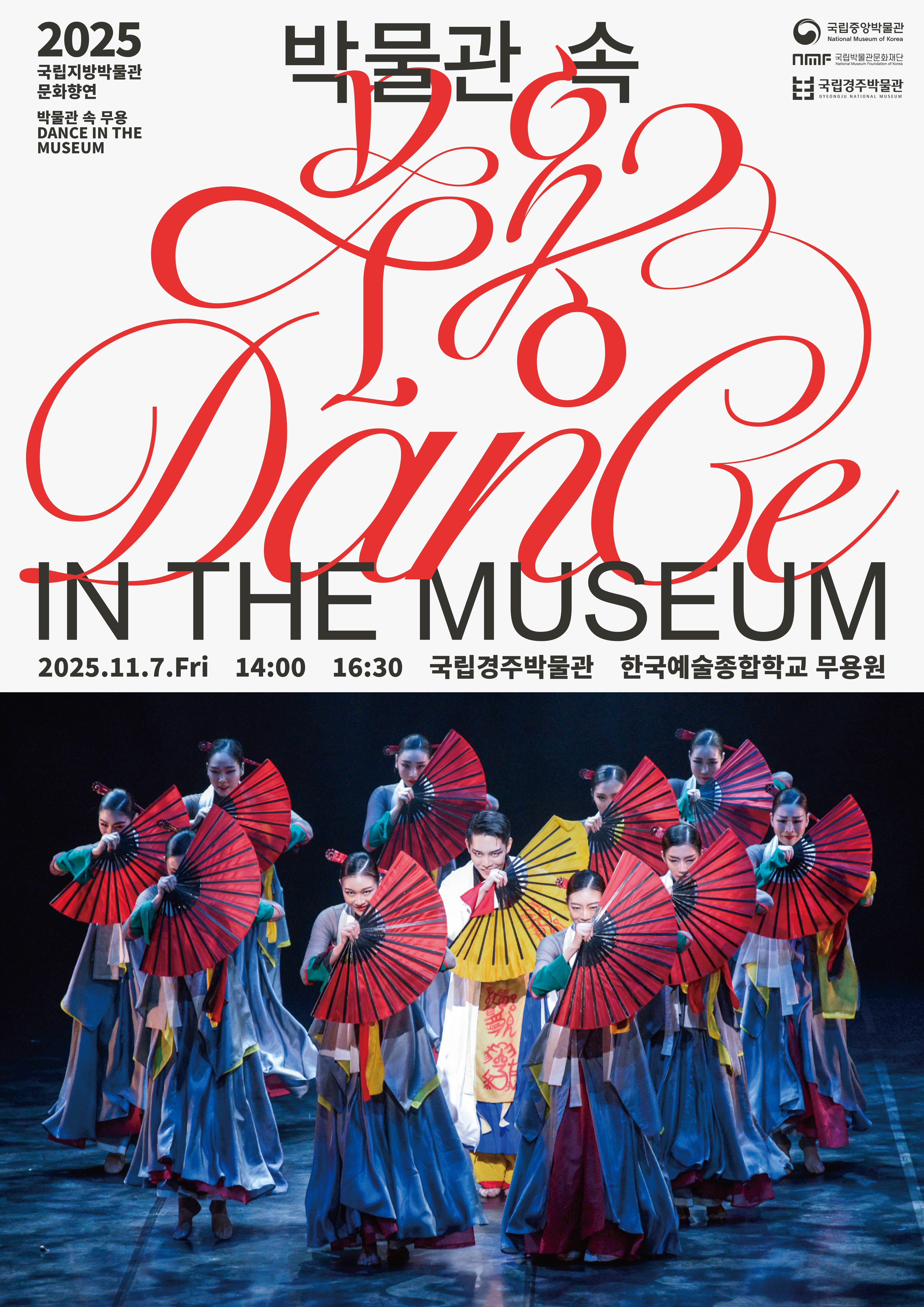 국립경주박물관에서 진행되는 박물관 속 무용 <국립경주박물관:한국예술종합학교 무용원>의 공연정보를 아래와 같이 안내 드리오니 많은 관심과 참여 바랍니다. □ 공연개요 가. 공 연 명 : 박물관 속 무용 <국립경주박물관:한국예술종합학교 무용원> 나. 공연일시 : 2025.11.7.(금) 14:00 / 16:30 다. 장 소 : 국립경주박물관 라. 출 연 진 : 한국예술종합학교 무용원 - 한국예술종합학교 무용원은 1996년 설립 이후 세계적 예술가들과 협력하며 전문성과 창의성을 갖춘 무용가를 양성해왔다. 발레, 현대무용, 한국무용 등 다양한 전공을 통해 실험적이고 예술적인 교육으로 세계적인 예술가를 배출하고 있다. 마. 관 람 료 :무료 바. 러닝타임 : 약 60분 사. 주최/주관 : 국립중앙박물관 / 국립박물관문화재단, 국립경주박물관 아. 문 의 : 1544-5955